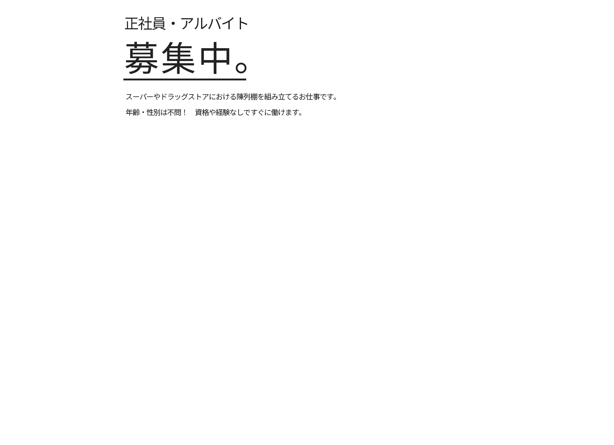 主にスーパーやドラックストア、ホームセンター、家電量販店といった現場での作業をメインに行っており、新店工事・閉店工事と幅広く対応しています。